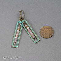 I used rectangular brass drops, ~9x40mm, with a painted distressed finish that has a verdigris appearance. I loved the mint green color with highlights of yellow brass showing through. The rectangles form a frame around a linear drop of 3x4mm faceted pink opal rondelles that I strung on red brass wire. A textured brass bead punctuates the pretty assorted pink stones. Ear wires are also jeweler’s red brass, handmade in 20 gauge wire.