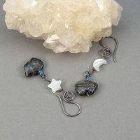 I wired these 10x14mm jasper bears with 3mm faceted blue kyanite gemstones and a thin sterling silver disc. One bear hangs from a mother of pearl crescent moon (about 8mm long) the other from a mother of pearl star (about 8mm in diameter). All metal is sterling silver, including my handmade ear wires.