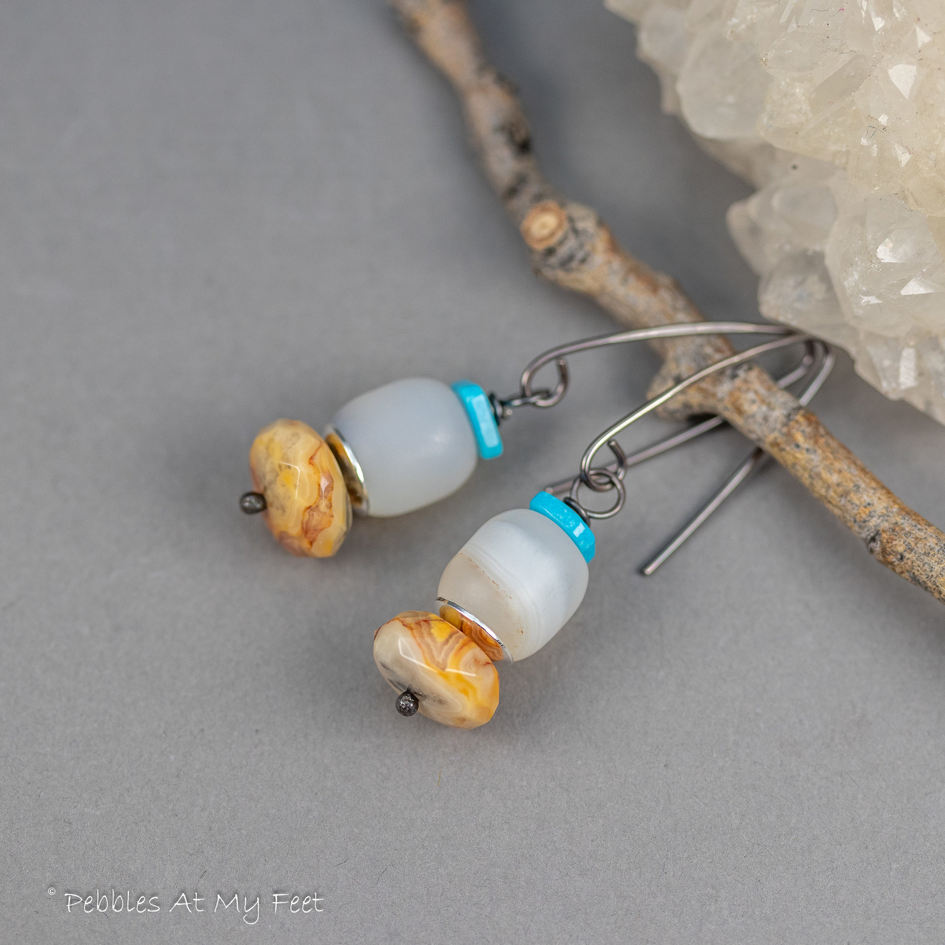 These chunky beaded drop earrings feature white Montana agate barrels, yellow crazy lace agate, and genuine Nacozari turquoise. Sometimes, a bright blue piece of turquoise, no matter the size, can be the crowning touch in a design. I feel that’s what happened with these earrings. I was plenty happy with the chunky Montana agate barrels and cheerful yellow crazy lace agate for these beaded drops and they almost stayed that way. UNTIL I was in my turquoise box and picked up these Nacozari turquoise thin square heishi.
