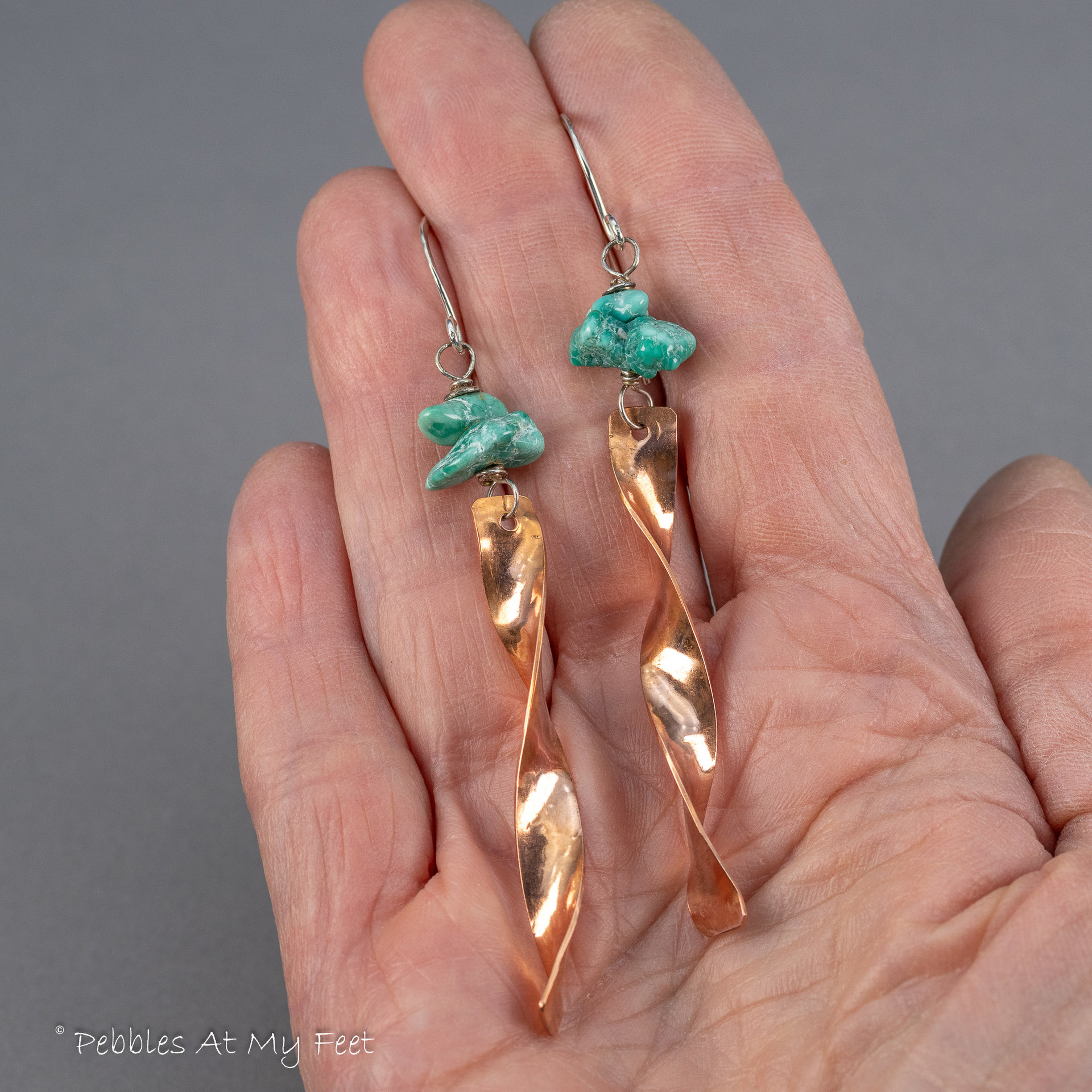 To form the copper from flat wire to twisted and curved, I worked the copper strip wire using various hammers on a heavy pine block. The strip was curved top to bottom first then twisted along its length. I love how the shadows and highlights of the polished copper give a sense of movement even at rest. As the earrings took shape in my hands, I thought of the cool wind sculptures and windchimes I've seen and figured the name was apt. Turquoise and polished copper are beautiful together and so evocative of the windy landscapes in the west and southwest.
