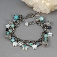One of a kind gemstone charm bracelet in metallic gray, black, pastel aqua, white, and clear hues has an heirloom feel in dark patina sterling silver. The bracelet is themed "Wish Upon A Star" and features gemstone stars beads in several types of stone, as well as natural stone beads in various shapes.