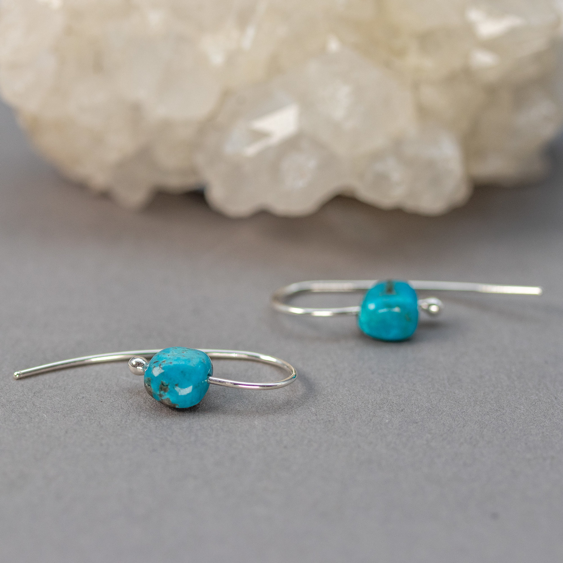 These turquoise drop earrings are made in shining sterling silver with blue Hubei turquoise squared nuggets. The earwire is shaped into a cute apostrophe or comma shape with a short drop and long tail. The 7-8mm roughly cubic shaped turquoise stone is captured on a piece of 20 gauge sterling silver wire with a torched ball end. Pure and simple, if you love turquoise, a little set of earrings like these could become your everyday favorite pair.