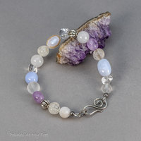 Icy clear quartz, pastel blue chalcedony, and lavender amethyst combine to paint a soft January scene in this winter-inspired bracelet. Pastel cool colors of white, lilac, and sky blue play with crystal clear stones and silver accents just like the sky and snow-covered landscape reflect and play with color and light.