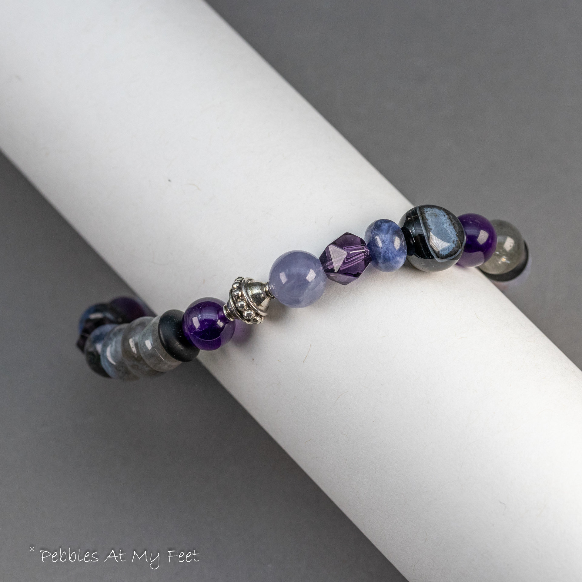 This purple, gray, blue, and black gemstone stretch bracelet was inspired by the wonder of the night sky. You know, when it is dark, but not really black, and you can see diffuse starry clouds and the bright glint of the moon. Perhaps you’re even treated to the aurora borealis.