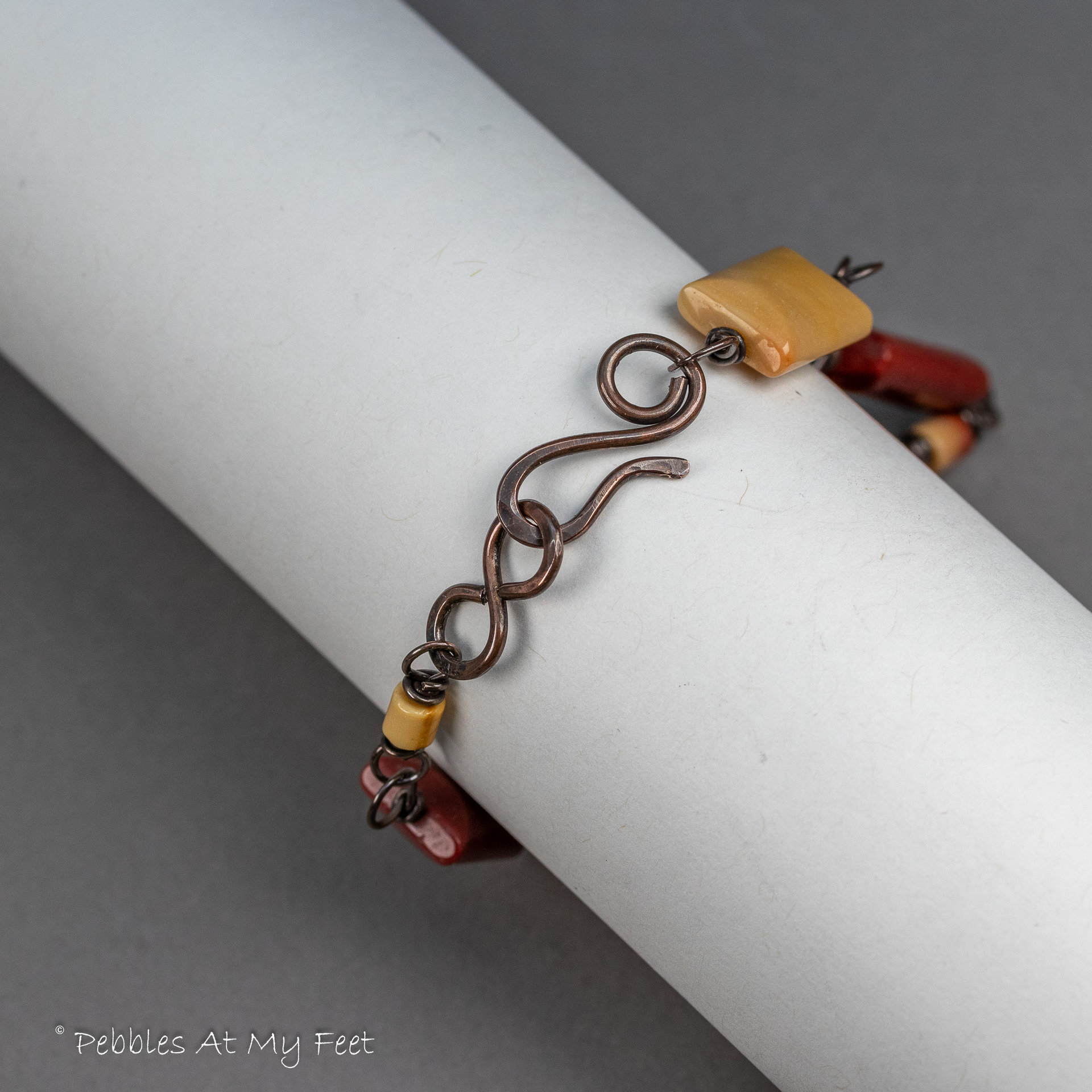 Made with mookaite pillow cut 10 x 14mm rectangles, and 4 x 4mm tubes wired into links using copper wire. Each stone link is joined to the next in and alternating pattern: rectangles then tubes. The closure is my handcrafted copper hook and infinity link eye.