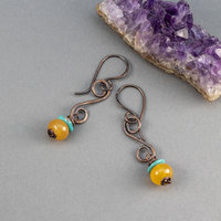 Each plump yellow stone rondel is topped with a thin disc of Arizona turquoise and dances beneath a hammered copper elongated s-link. The ear wires are handmade by me in 20 gauge copper wire. All the copper has a rich, dark patina that makes the yellow stones pop.