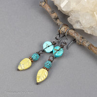 These rustic small dangle earrings attempt to convey the brilliance of that experience with yellow “turquoise” (serpentine) leaves, genuine Mexican powder blue turquoise, and turquoise patina copper metalized ceramic beads. They are wired in darkened copper and presented on handmade copper French hooks so the colors pop.